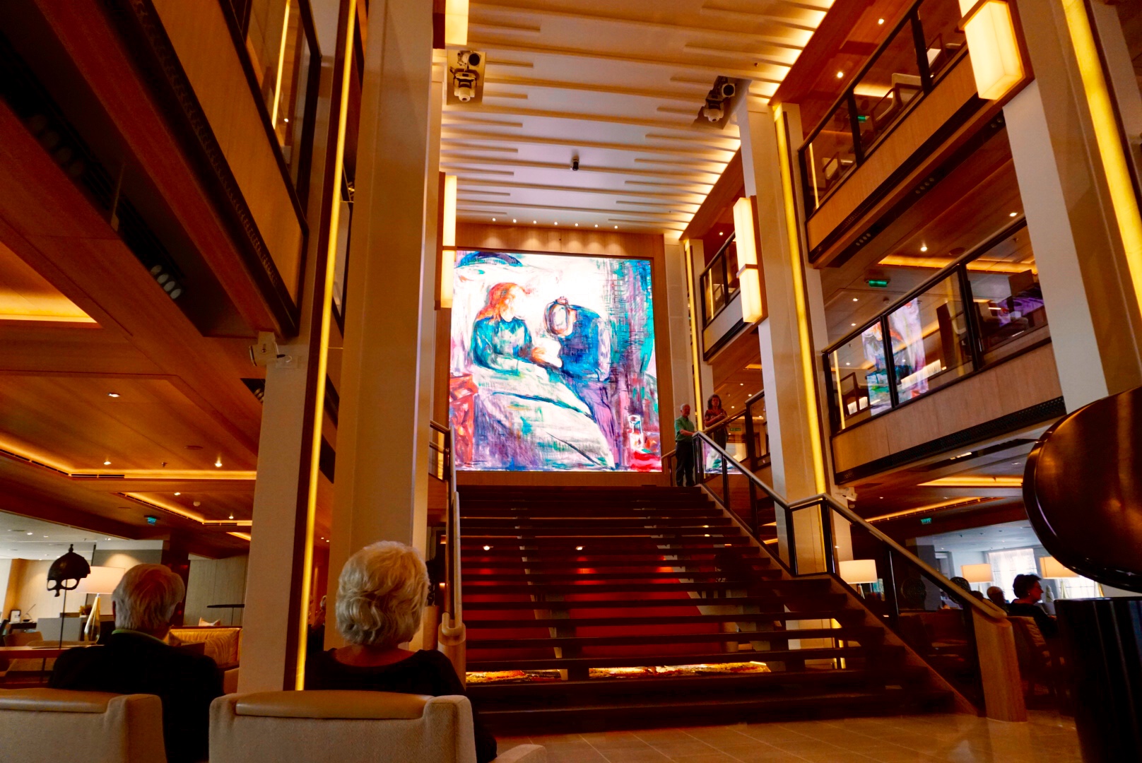 The ships Atrium is a remarkable event space amidships. 3 stories tall and featuring a grand stairway at one end. This elegant venue is the social heartbeat of the ship. One has an unobstructed view of both port and starboard. The space contains an impressive art collection and ancient Viking artifacts. Towering above the staircase is a huge HD screen that rotates images, often of nature, or pieces by a featured artist. This evening that artist was Edvard Munch. We were treated to a display of a few of the most famous of his over 2,000 works concurrently with a classical piano performance. A full color booklet provided the historical background of each painting. I have included some of the images, most notably, “The Scream”.